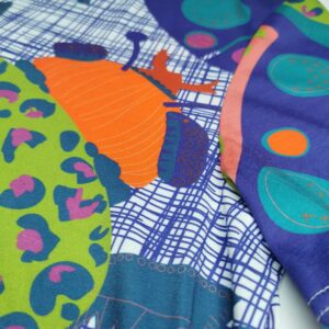 Der Käfer besteht sowohl aus Punkten, Streifen als auch aus Leomuster, der Hintergrund ist ein gestricheltes multicolor Farbspiel- daher vielseitig kombinierbar.