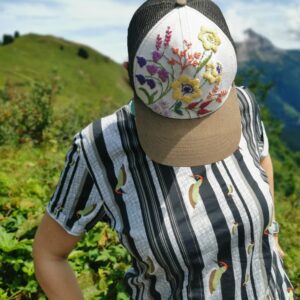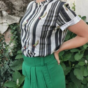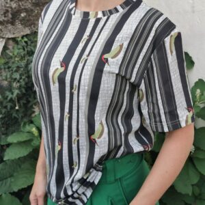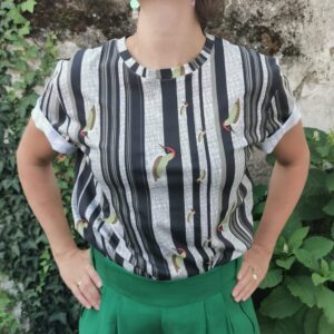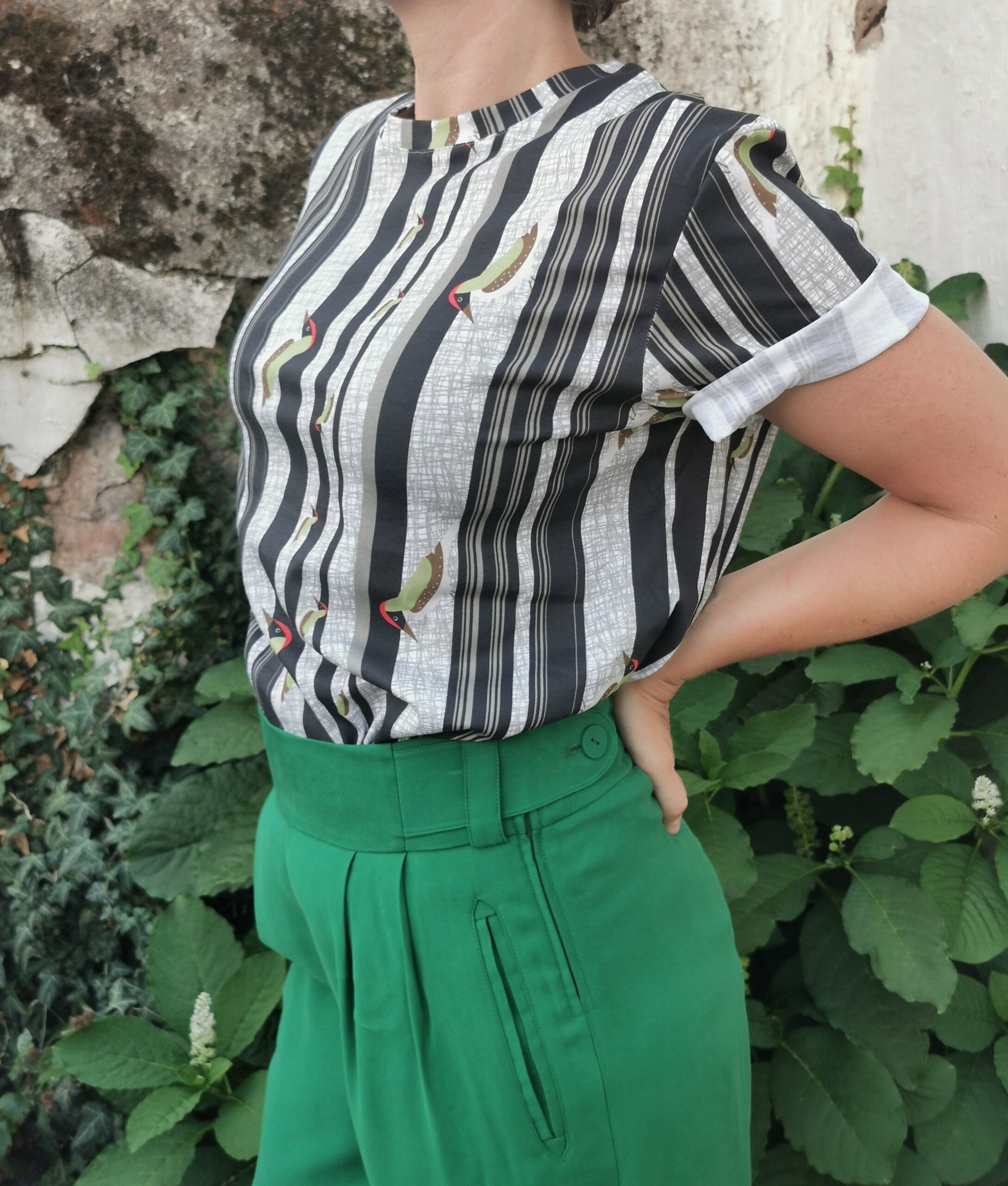 Das Shirt kann mit Ärmelaufschlag oder ohne getragen werden und ist toll in diverse Farbspiele zu integrieren. Schwarz und weiß werden mit grün, rot und braun aufgefrischt.