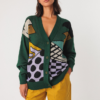 Graphisches Blumenmuster im Allover Strick mit blau abgesetzten Tascheneingriffen und elastischem Bund.